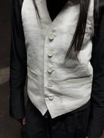 The White Linen and Leather Jacket by Paradoxe Paris redefines the boundaries between lightness and structure. Crafted in linen for its natural breathability and refined texture, this sleeveless piece is elevated with leather detailing, introducing a subtle contrast between softness and rigidity.