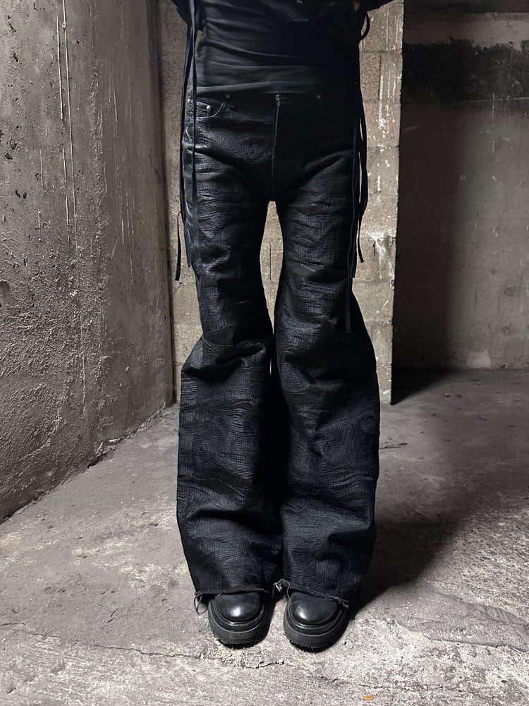 The Blazed Crow Denim by Paradoxe Paris combines a raw textured finish with a wide straight cut, merging classic denim codes with a contemporary edge. Distinctive stitching details enhance the silhouette, positioning the piece as a redefinition of traditional denim shapes and textures.