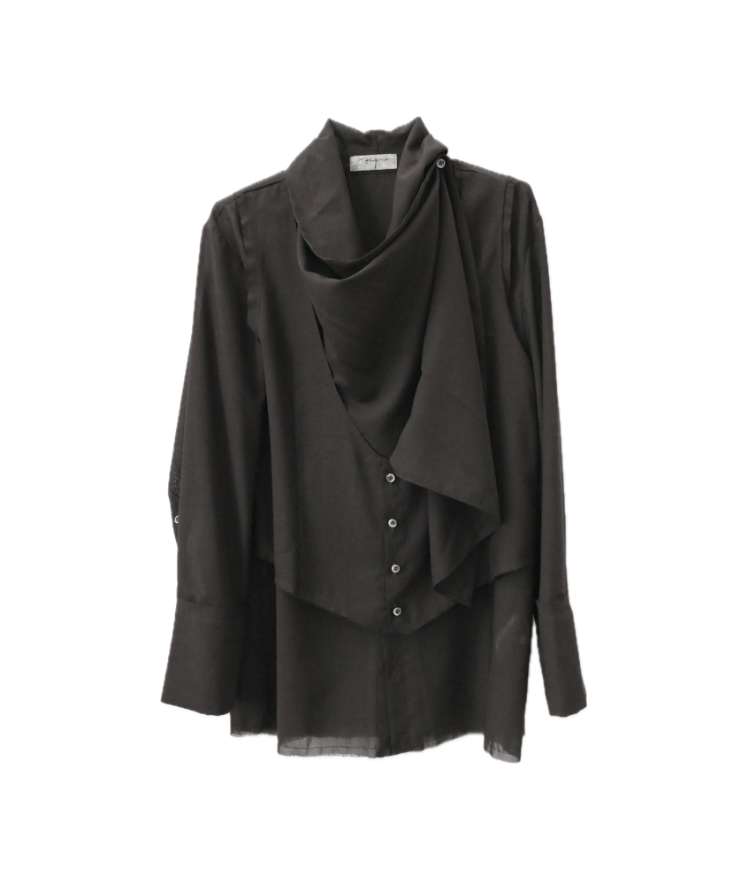 Constructed from a 50% wool and 50% polyester blend, this draped shirt embodies Rhyzem’s sculptural approach to tailoring. The asymmetric cut and layered front create fluid movement, while the deep brown tone emphasizes its refined yet experimental silhouette.