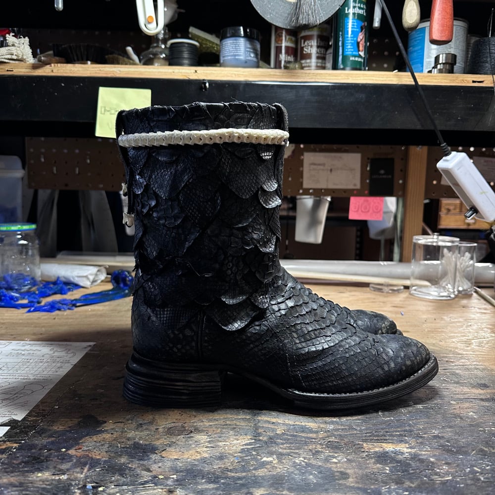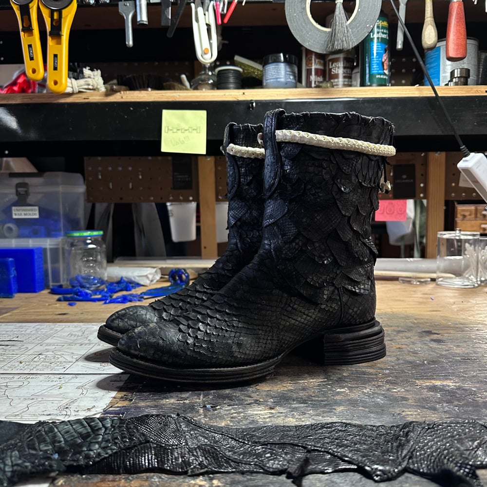 Handcrafted with uncompromising attention to detail, these boots feature distressed python uppers meticulously hand-sewn scale by scale. The lower construction combines a stacked leather base with Vibram soles for durability and presence. Along the top, genuine snake vertebrae create a striking natural adornment, elevating the silhouette into an artifact as much as footwear.