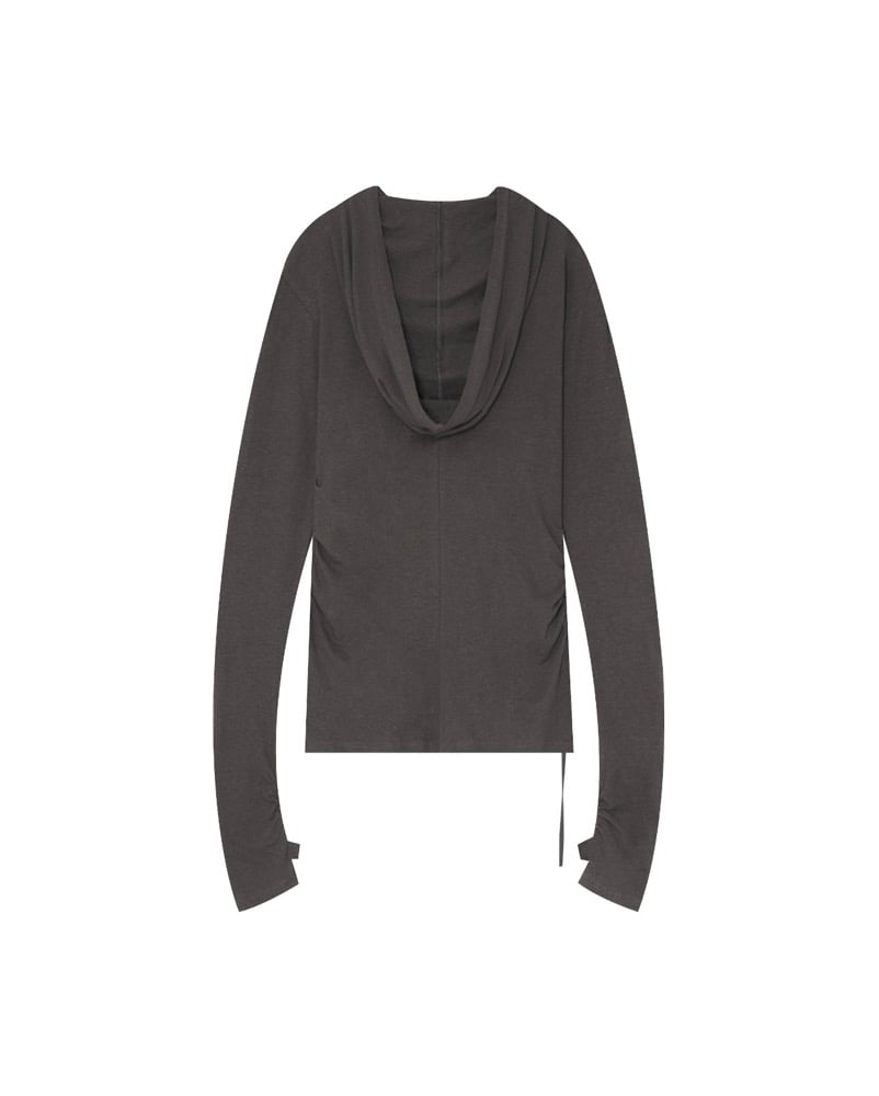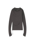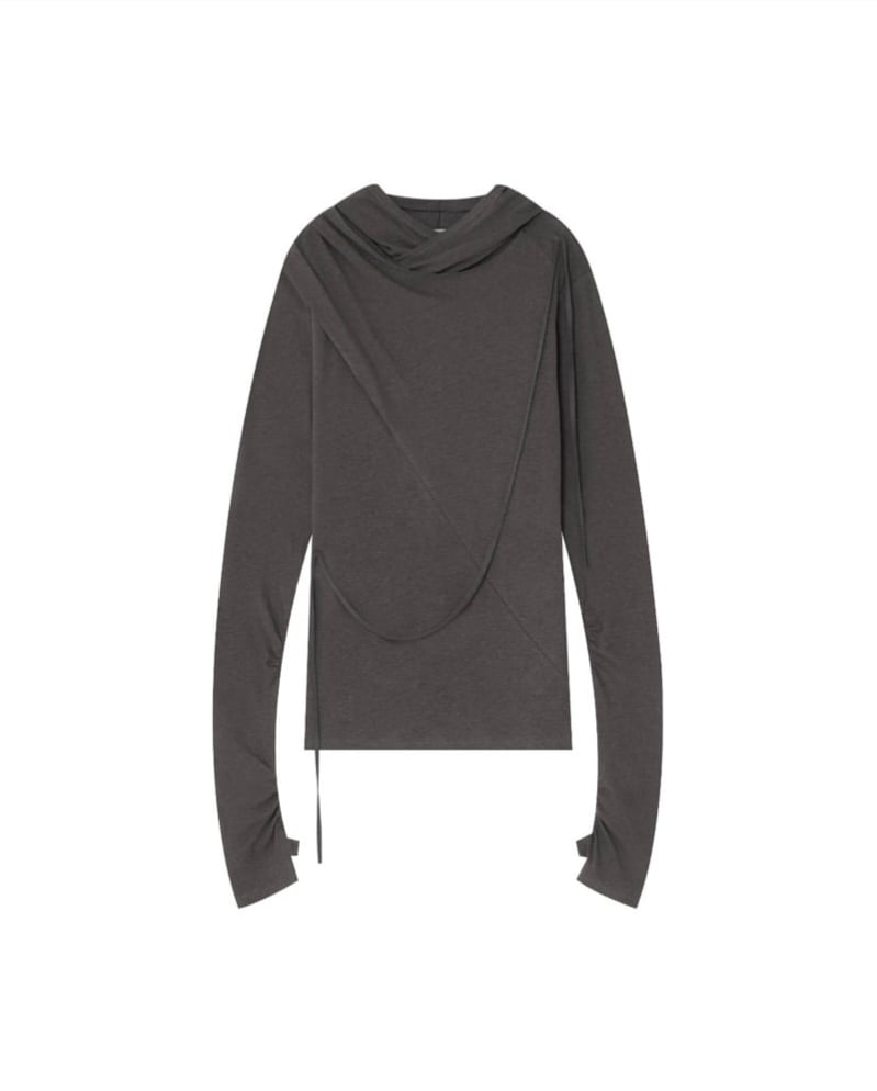 A hooded long sleeve crafted in a cotton linen blend with a coarse texture. Shirring runs along the neck, shoulders, sleeves and body, creating a draped silhouette. The oversized hood features a gathered crossed neckline detail, while elongated sleeves extend over the hands with a thumb slit for a glove-like fit. A detachable 200cm string runs through two loops, one at the left shoulder and the other at the right waist, allowing adjustments in length or complete removal. Designed as a unisex piece.