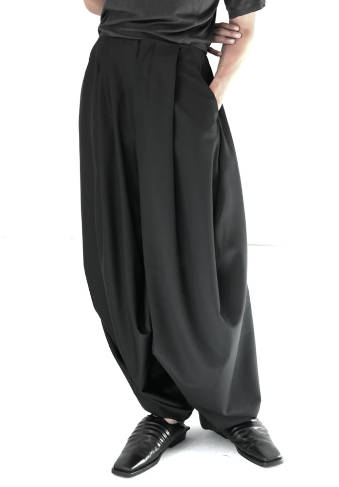 Crafted from a blend of 50% wool and 50% polyester, these trousers reinterpret the archetype of wide silhouettes through Rhyzem’s distinct lens. The one-piece construction emphasizes fluid volume and sculptural drape, merging comfort with a strong architectural presence.