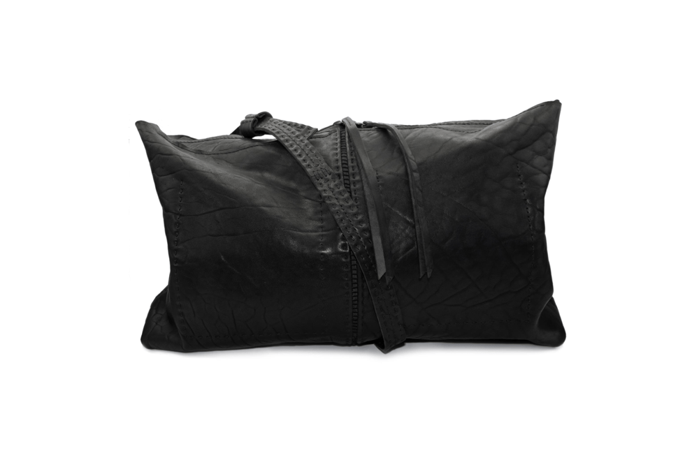 This shoulder bag features a split-pattern construction and is fully handcrafted from 2.7mm full-grain vegetable-tanned horse culatta leather — washed, tumbled, and finished in a matte “rotten corpse” black dye. The surface reveals a raw, textured grain with deep tonal complexity and subtle natural variation.