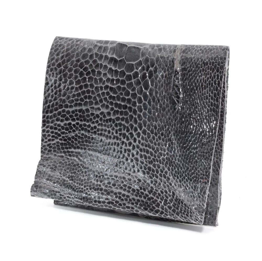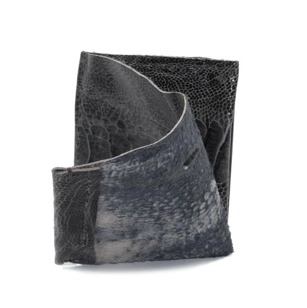 A compact bifold wallet, carefully hand-cut from semi-gloss ostrich leg leather. The surface reveals a natural scale-like texture, each pattern shifting uniquely with the light, while the distressed black dye treatment enhances depth through subtle tonal variations. Lightweight yet structured, the design relies on a single-piece construction, hand-stitched with waxed Japanese linen thread. Inside, two landscape card slots allow space for up to eight cards, alongside a full compartment for notes. Every detail reflects a focus on minimalism and tactility, carrying the imprint of time and handcraft. Each wallet is delivered in a handmade leather pouch. By Atelier SKN.