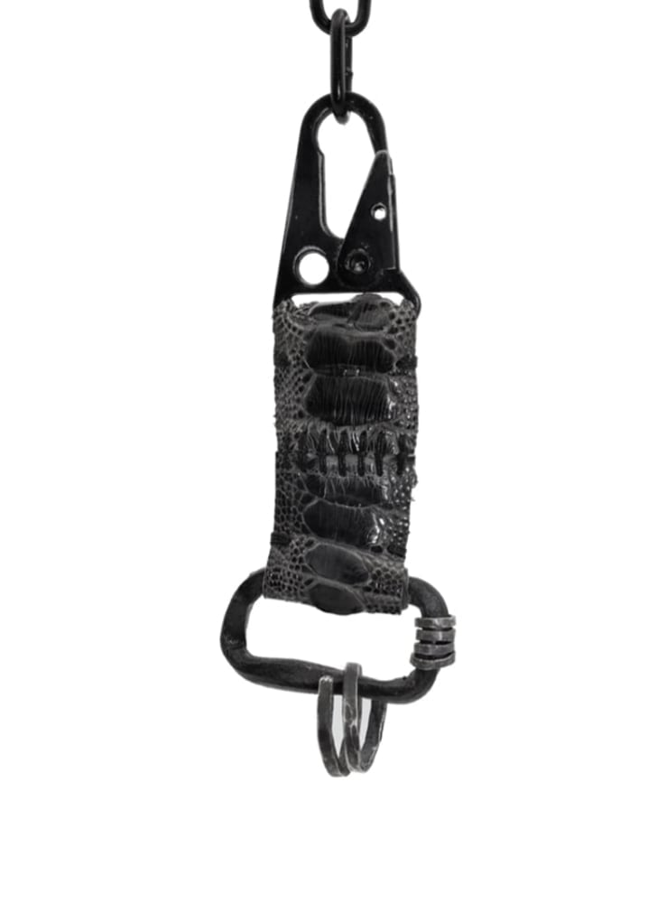 A distressed military sling clip allows for seamless attachment to a bag, belt loop, or waistband. The piece is accented with hand-forged iron hardware and a hand-cut, shaped, and hammered 3mm sterling silver key ring (.925), oxidised over 10 hours for a deep, weathered patina. A 2mm .925 sterling silver wrap detail completes the composition, offering a subtle contrast between refined metalwork and raw materiality.