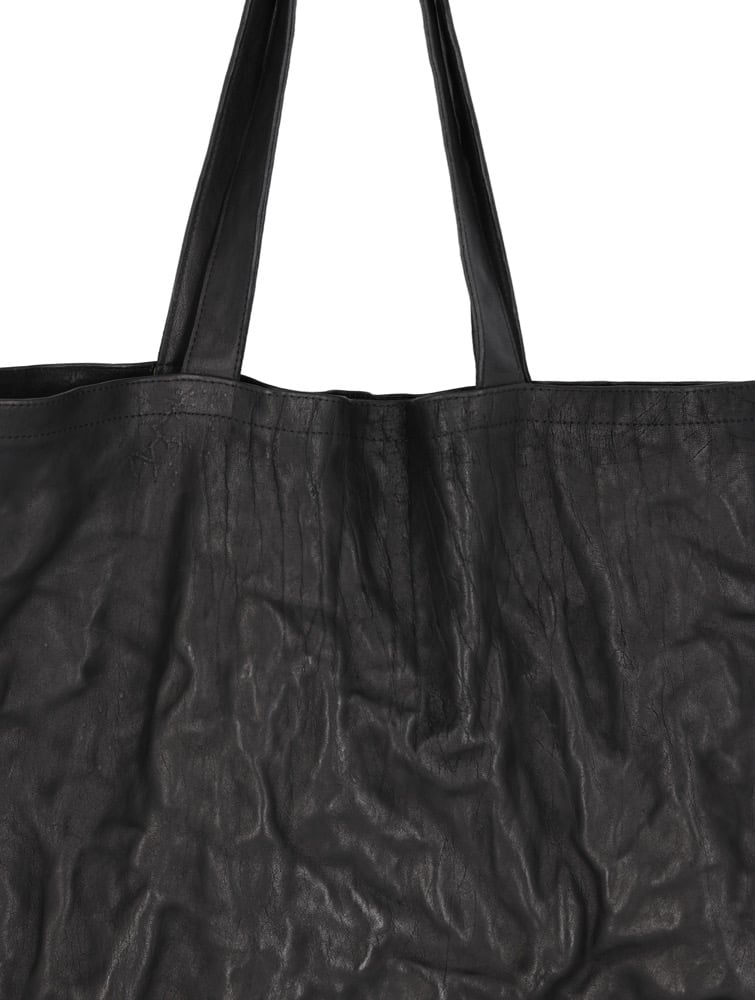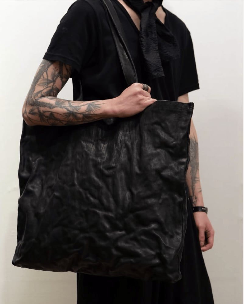 An oversized tote bag defined by its minimal, architectural silhouette, fully crafted from Italian vegetable-tanned cowhide leather. The natural texture of the leather offers a raw, refined touch while ensuring long-lasting durability and a rich patina over time.