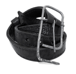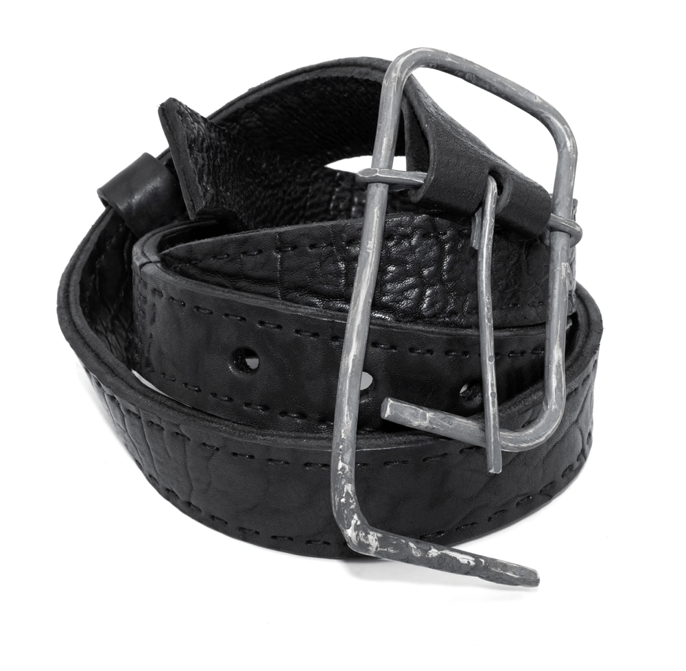 This double-layered belt is entirely handcrafted from 3mm vegetable-tanned horse culatta leather, washed, tumbled, and hand-dyed in a deep matte black “rotten corpse” finish — a surface alive with depth, grain, and tonal irregularity.
