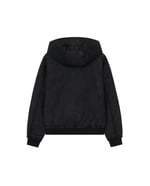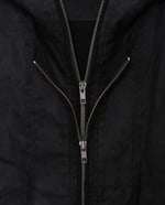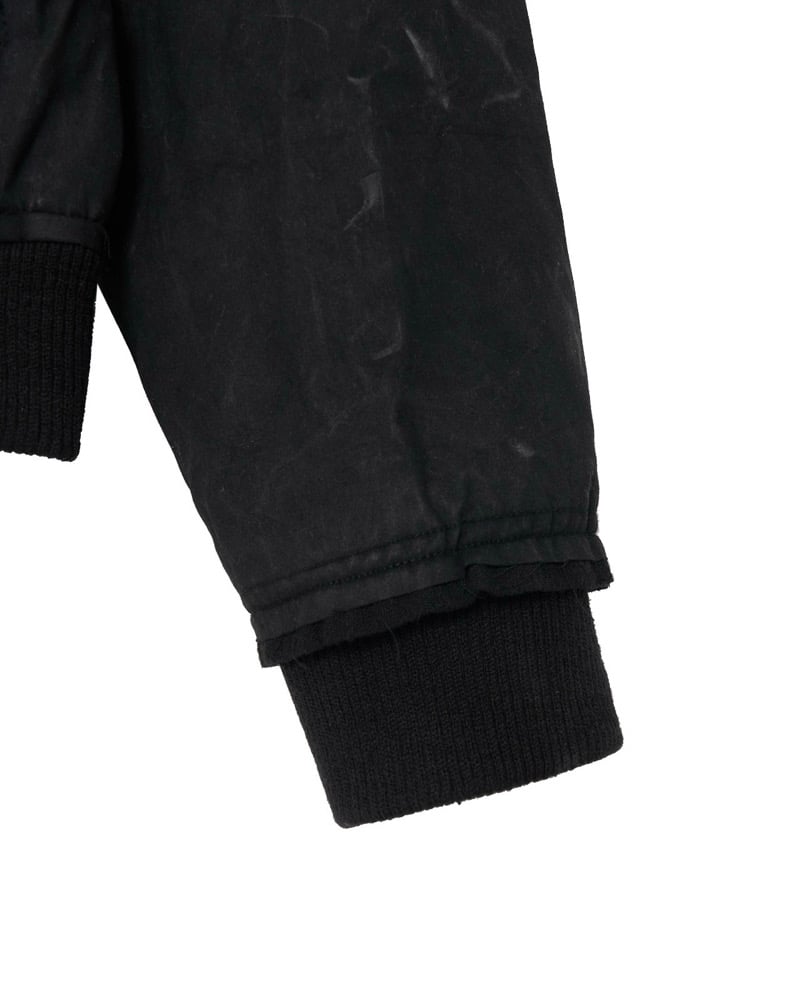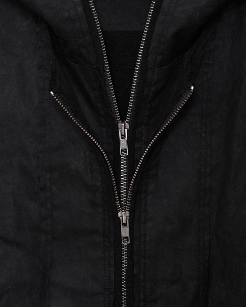 Wax-coated bomber jacket crafted in cotton with a surface treatment that develops natural creases and marks over time, building a distinctive vintage character. Designed in a relaxed drop-shoulder silhouette with ribbed hem and cuffs, the piece is fully lined in a textured contrast fabric that emphasizes Harte Ordemn’s rough mood. Front zippers and seam lines merge both outer and contrast fabrics, creating a layered interplay of textures. Most seams and edges are left raw, allowing the waxed cotton to fray progressively and enhance its expressive nature. An oversized hood with dual seam lines is lined in the same textured fabric. The double-layered front closure features two antique silver YKK zippers, also used for the pockets. Intended for seasonal wear, this jacket layers easily into early winter but is not designed as heavy outerwear.