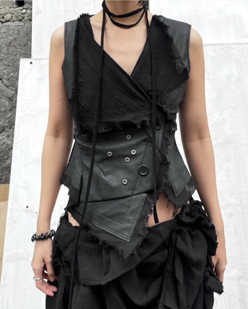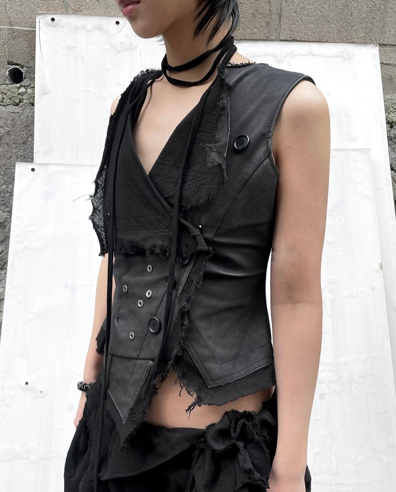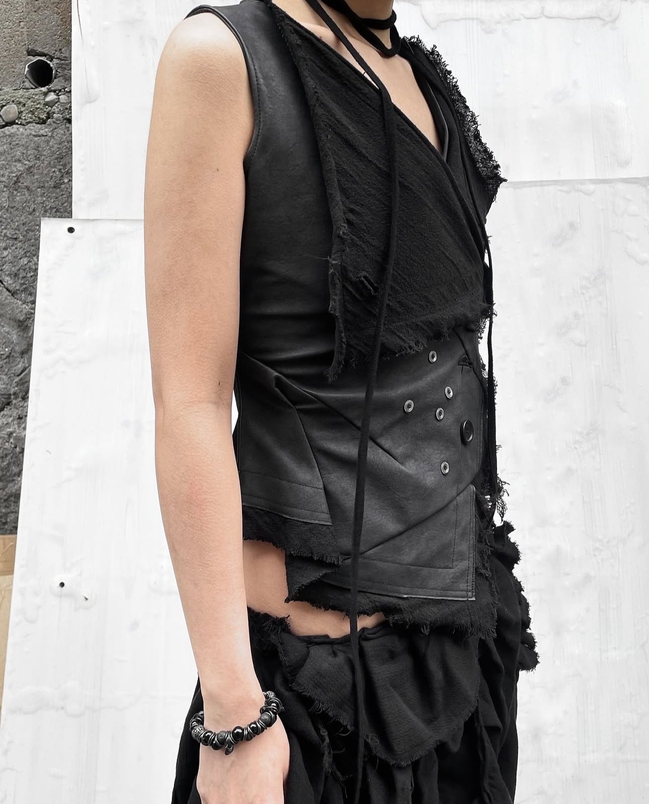 The Unbalanced Vest by Harte Ordemn explores asymmetry and versatility through a slim-fitting silhouette cut in a linen and faux leather blend. Finished with raw-cut edges, the fabric is left to fray naturally, enhancing the garment’s deconstructed identity.